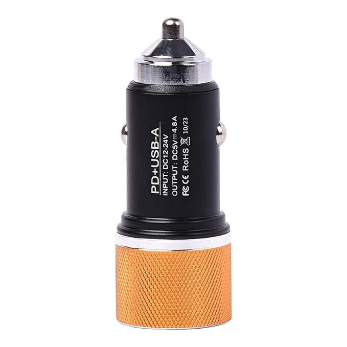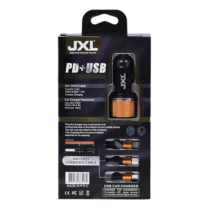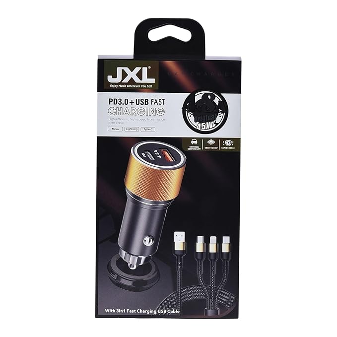 JXL 45 W Ultra Fast Charger with Dual Output, Type C PD 25W & 4.8A with 3 in 1 Fast Charging USB Cable, Compatible with iPhone, All Smarphones, Tablets and More (Golden & Black), Best Type C Ultra-Fast Car Charger with Dual Port in India.